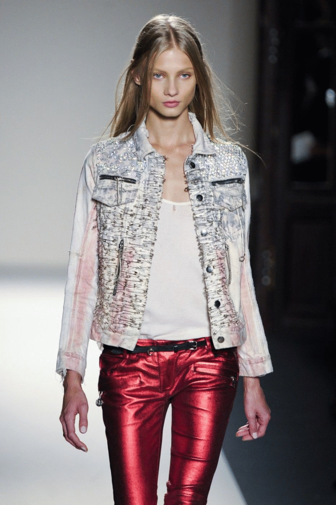 Balmain’s S/S 2011 runway was dominated by garments featuring the stars and stripes, but not in their pristine form. Instead, the flag appeared burnt, torn, and frayed, layered with studs and pins that evoked punk rebellion. This was not fashion as decoration; it was fashion as confrontation.
